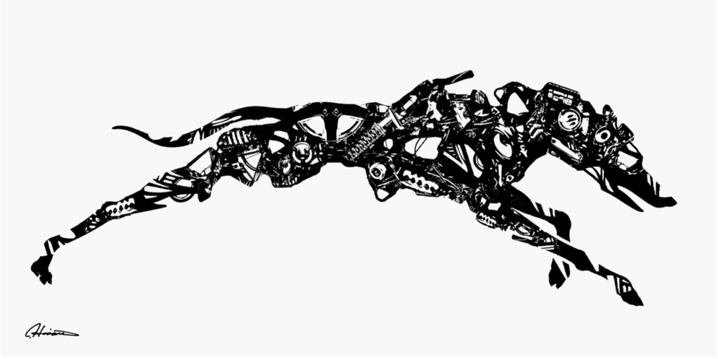 『本作品は、動物進化の過程を抽象的なフォルムとして視覚化した試みである。生命はおよそ 35 億年前に海中で誕生し、単細胞から多細胞へと発展しながら、環境の変化に応じて多様な姿を獲得してきた。その歩みは直線的な階段ではなく、分岐と淘汰を伴う複雑な網目であり、数え切れない試行錯誤の積み重ねによって今日の生物多様性が形づくられている。今回取り入れられたグレイハウンドのモチーフは、その俊敏さと流線型の身体を象徴的に抽出し、抽象的なフォルムに溶け込ませている。鋭い線は生存への推進力を、しなやかな曲線は進化の連続性と分岐の多様性を示唆する。そこに浮かび上がるグレイハウンドの影は、個別の犬種を超え、生命が「スピード」という適応を選び取ったひとつの形態を象徴している。観る者がこのフォルムに動物の痕跡を見出すとき、進化は単なる過去の歴史ではなく、現在も続く変化のリズムとして立ち現れる。本作は、抽象化されたグレイハウンドを通して、生命の進化がもつ普遍的な動的プロセスを体感させるものである。』
