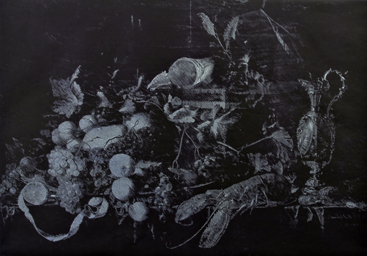 一見、写真のように見える彼の作品は、自身で撮影した写真を基にすべて手で彫られています。光の陰影は彫りの深浅、幅の広狭で表現されており、その卓越した技術によって実際の空気感までをも感じさせ、寄り添う記憶や視覚の残像のようなイメージを織り成しています。